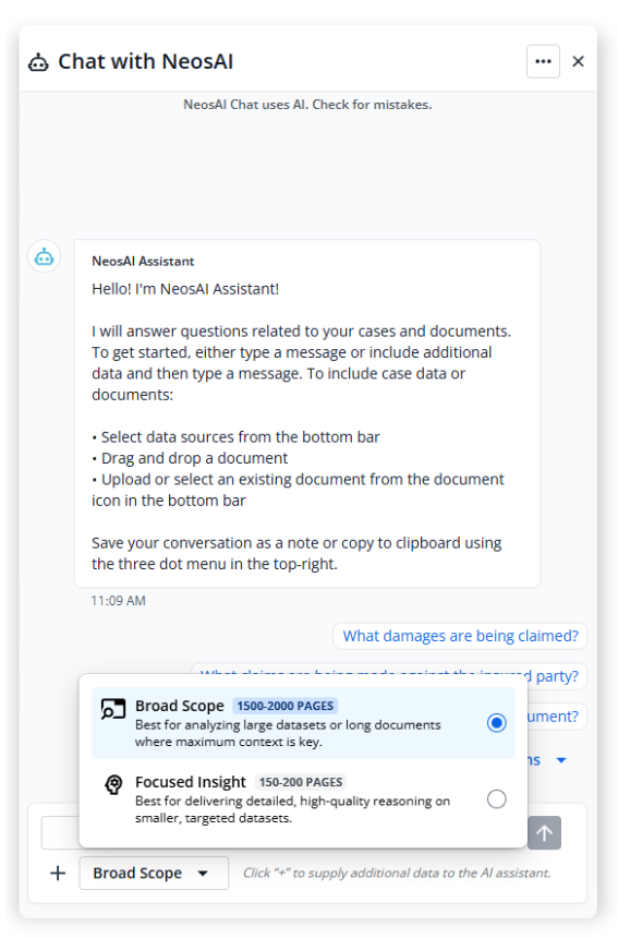 When you first open a case, use NeosAI Chat to quickly understand what you’re working with. No scrolling, highlighting, or re-reading required. Just ask and get instant answers!