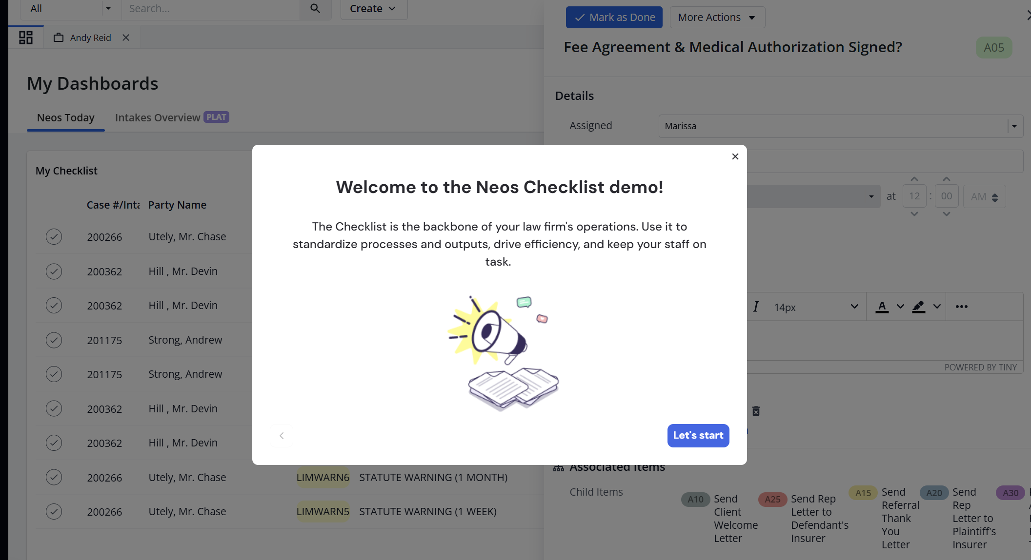 The Checklist is the backbone of your law firm's operations. Use it to standardize processes and outputs, drive efficiency, and keep your staff on task. Take a peek for yourself.